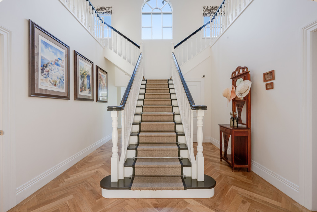 Upon entry, a breathtaking sense of scale unfolds. French Oak herringbone flooring anchors the home with warmth and elegance, complemented by detailed ceiling roses, bespoke timber panelling and refined finishes throughout. At the centre of the home, an imperial staircase forms a dramatic focal point, connecting the grand ground-floor living zones with the private upper level accommodation.